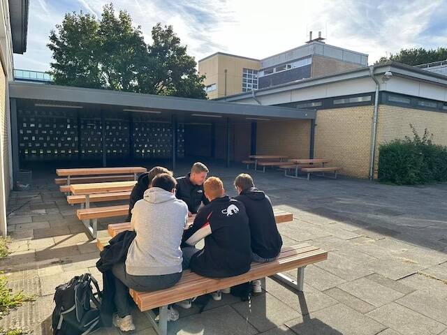 Passend zum spätsommerlichen Sonnenschein ist unser Schulhof heute mit fünf Tisch-Sitzgruppen ausgestattet worden. Die massiven Holztische laden zum Reden, gemeinsamen Arbeiten und Frühstücken in den Pausen und Freistunden ein.