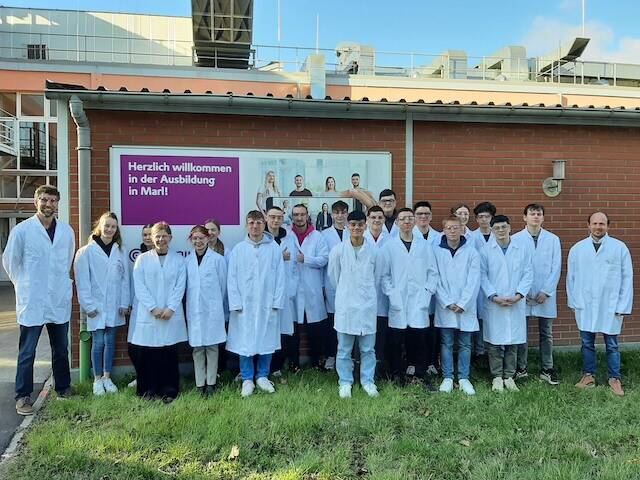 20230301 093851Auch in diesem Jahr konnten wieder 20 Schüler_innen aus der EP an einem zweitägigen Praktikum bei der Firma Evonik im Chemiepark Marl teilnehmen. Dabei lernten die Jugendlichen sowohl die Laboratmosphäre als auch die großtechnischen Apparaturen im Chemiepark kennen. Im Labor wurde Acetylsalicylsäure (ASS, Aspirin-Wirkstoff) im Milliliter-Bereich hergestellt, im Produktionstechnikum Gips nach Litermaß.