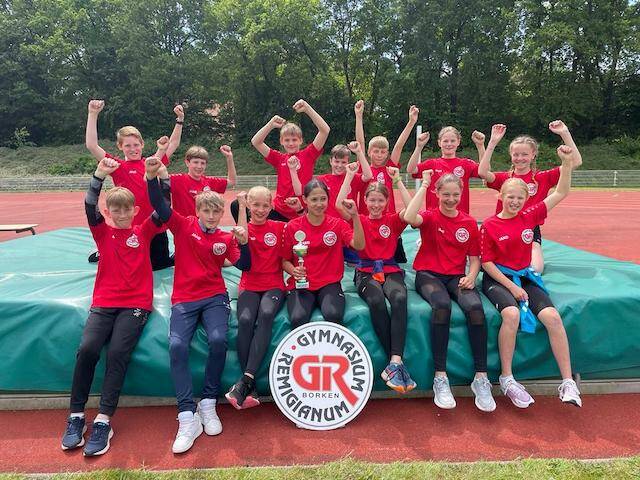 66653e62 4c2f 4dad a466 a8102268dde9Die Mannschaft des Remigianum der WK IV sicherte sich heute den Kreismeister-Titel 2023. In allen Lauf- und Wurfdisziplinen zeigten sie sich erfolgreich und mussten sich nur beim Ring- und Medizinball-Werfen geschlagen geben.