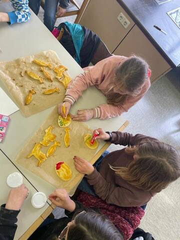 OsterbackenAuch in der Back AG geht es österlich zu. Hasen und Eier werden ausgestochen und mit Zuckerguss verziert und natürlich fehlt auch der Möhrenkuchen nicht. Sicherlich werden einige Rezepte in den Ferien zuhause probiert.