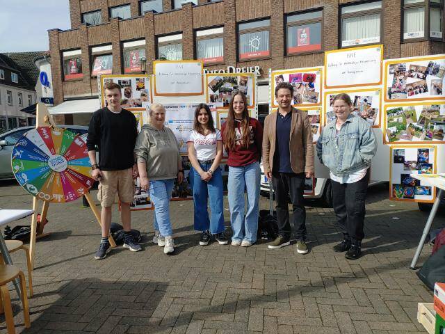 Im Jahr 2023 hat die RemiEarth AG die Schulprojekte auf Stell wänden auf dem Marktplatz der Stadt Borken präsentiert. Die zahlreichen Gäste (u.a. auch Politiker der Stadt/ Kreises, wie z.B. die Bürgermeisterin Frau Schulze-Hessing) wurden darüber hinaus in einer Rede zu den Projekten und die Entwicklung von BNE durch das Landesprogramm „Schule der Zukunft“ an unserer Schule informiert. Mit der Drehscheibe 17 SDGs, Postern und Infoblättern und Prospekten können sich die Gäste darüber hinaus über das Landesprogramm informieren.